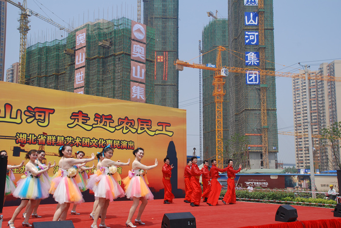 6月4日,开云app登录入口集团奥山世纪城项目施工现场鼓掌声、欢笑声、喝彩声不断,湖北省群星艺术团带来的惠民演出正在这里举行。开云app登录入口集团党委书记舒先厚,开云app登录入口集团湖北公司总经理林中茂、副总经理柯为正与四百多名农民工一道观看了演出。