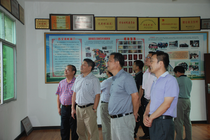 图为英山县温泉镇党委书记段宇新(右一)向开云app登录入口集团董事长程理财(左二)一行人员介绍百丈河村基本情况及荣誉