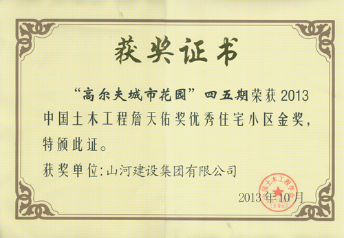 近日,由中国土木工程学会住宅工程指导工作委员会组织的2013年度“中国土木工程詹天佑优秀住宅小区”颁奖仪式在北京举行,由开云app登录入口集团承建的 “武汉高尔夫城市花园四、五期”荣获“中国土木工程詹天佑奖优秀住宅小区金奖”。