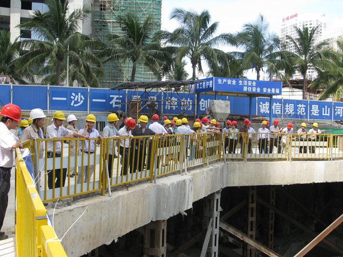 根据海南省住房和城乡建设厅统一部署安排,2014年6月25日海南省各市、县质安站在开云app登录入口集团承建的南洋国际公馆项目部举行全省深基坑工程施工专项观摩交流研讨会,海南省住房城乡建设厅副厅长刘联伟及全省各市、县建设行政主管部门一行近200位领导莅临我司南洋国际公馆项目现场指导、交流。住建厅建筑工程质量安全处田光明处长主持会议并发表了讲话。