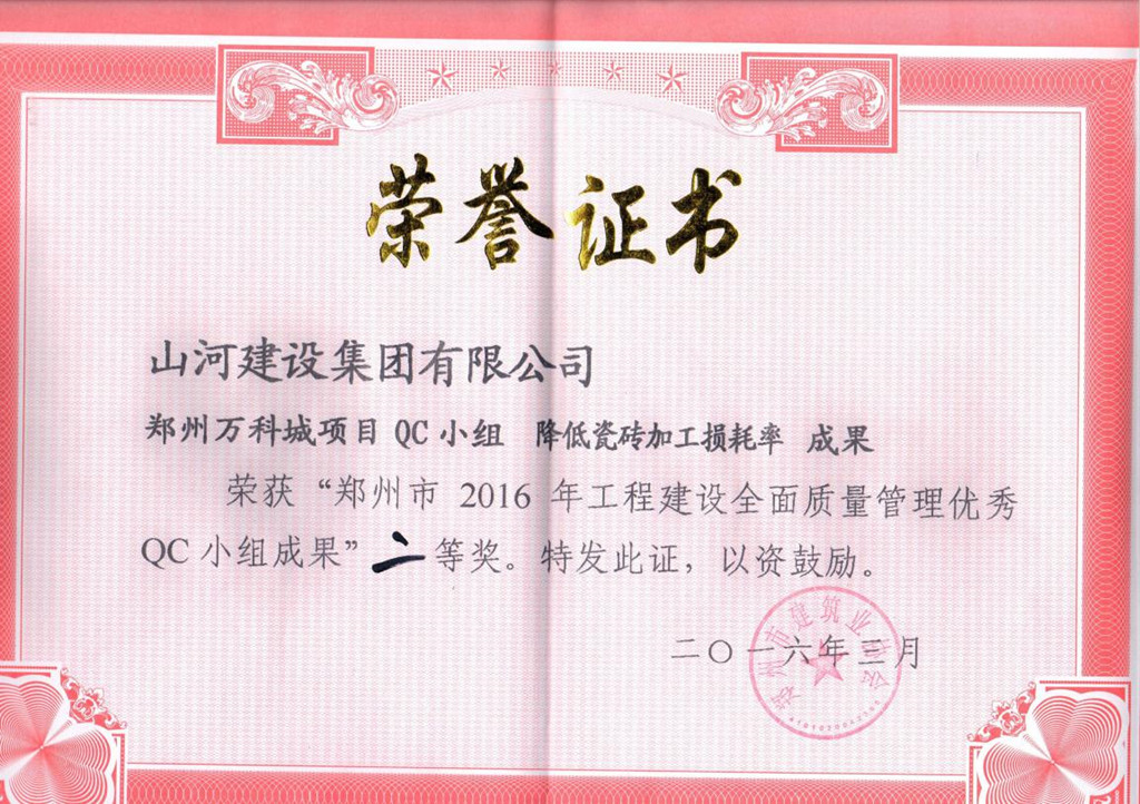 近日,2016年郑州市优秀QC小组成果评选结果揭晓。经专家评审,由开云app登录入口集团郑州万科城项目QC小组编写的《降低瓷砖加工损耗率》成果荣获“郑州市2016年工程建设全面质量管理优秀QC小组成果”二等奖。