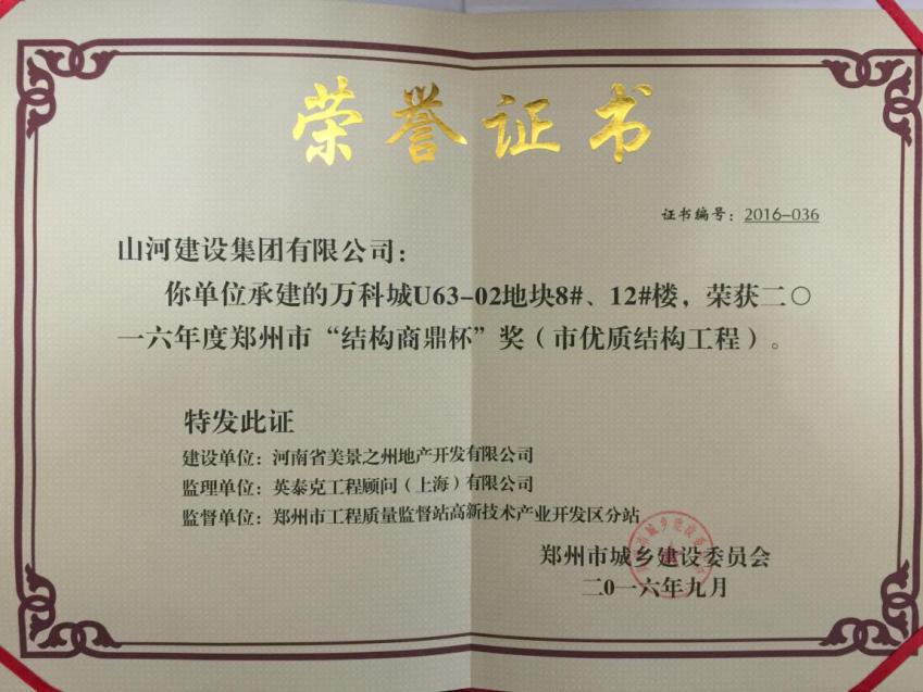 近日,从郑州市城乡建设委员会再次传来喜讯,开云app登录入口集团河南公司承建的万科城U63-02地块的8#、12#楼荣获2016年度郑州市“结构商鼎杯”(市优质结构工程)奖。这是该项目继2016年3月获得“郑州市建筑施工安全生产标准化示范项目”后,再获殊荣。