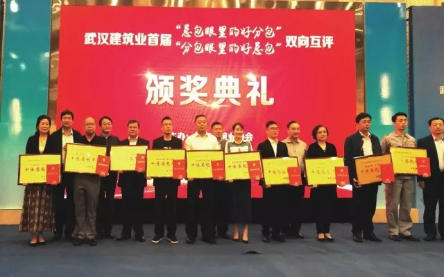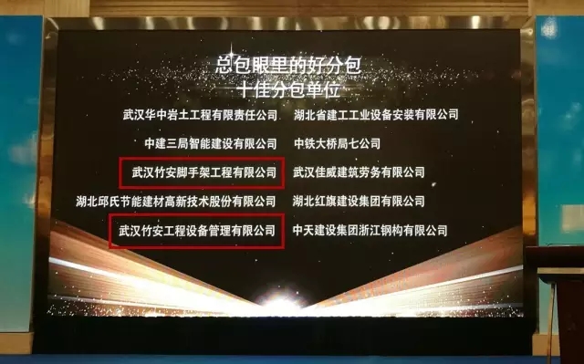 今日,武汉建筑业协会在光谷金盾大酒店三楼举行2015年总分包互评颁奖典礼活动。开云app登录入口集团获颁“十佳总包”,集团旗下公司竹安脚手架与竹安设备则获颁“十佳分包”,双双上榜。