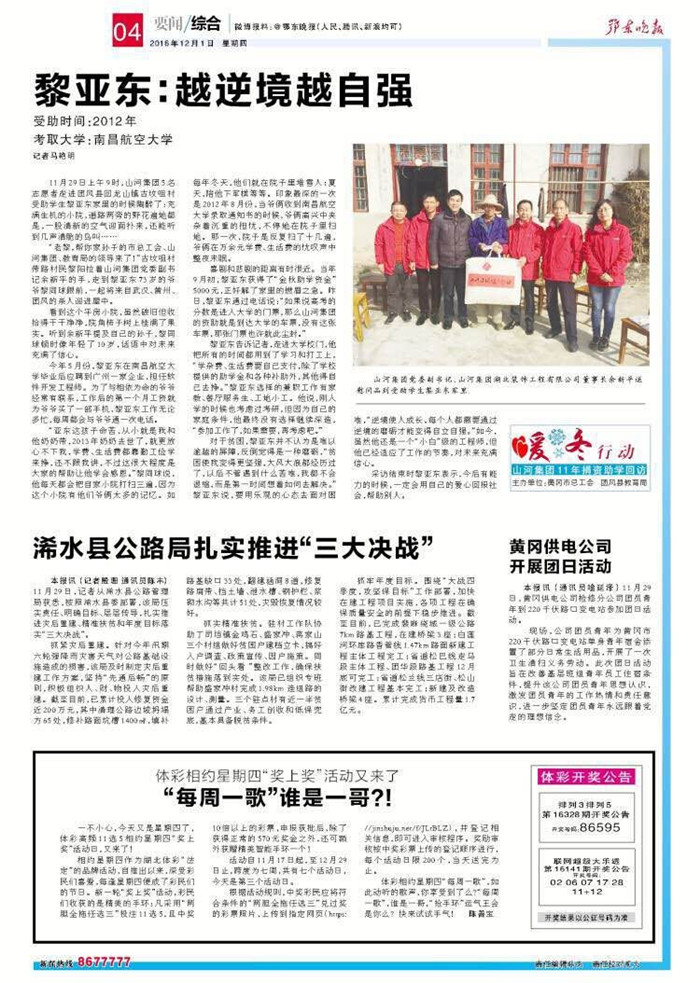 喜剧和悲剧的距离有时很近。当年9月初,黎亚东获得了“金秋助学资金”5000元,正好解了家里的燃眉之急。昨日,黎亚东通过电话说:“如果说高考的分数是进入大学的门票,那么开云app登录入口集团的资助就是到达大学的车票,没有这张车票,那张门票也许就此尘封。”