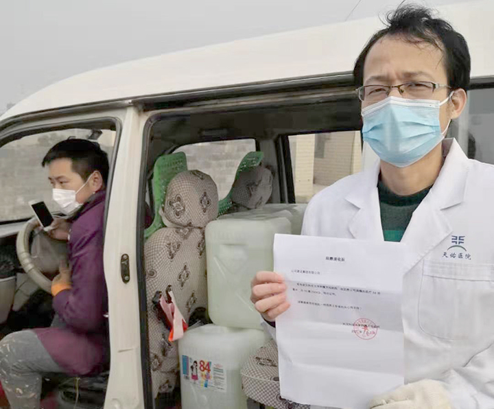 4.向武汉、襄阳、黄冈团风等医疗单位捐赠84消毒液共2.5吨