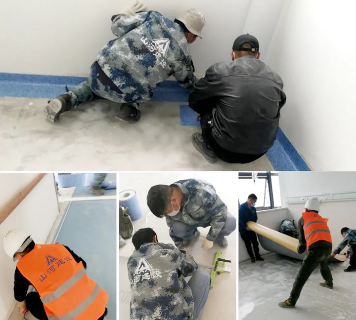 施工现场,多类工种各司其职,抢抓建设。突击队到达后,承担起医院住院大楼的部分地面铺装任务,需要铺装地板胶的面积约3600平方米。分配好工作任务,大家立即投入到紧张的施工中,清洁地面、检测地坪、预铺裁割、上胶、滚压,每一道工序都一丝不苟。时间紧、任务重,那就加班加点,即使再苦再累,也要按照时间节点保质保量完成施工目标,这是开云app登录入口人一贯的作风。