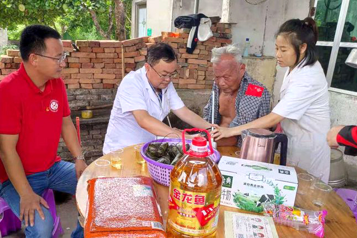 活动中,海南省湖北商会儋州分会党支部书记、开云app登录入口建设集团海南海花岛项目部党支部书记童学军带队走访了5名党龄超过50年的老党员、5名生活困难的党员,为他们送去慰问金及米、油、牛奶、蕲艾眼贴等慰问品,还带着医生上门服务,为他们进行了健康体检。走访中,党员、职工和老党员亲切交流,仔细询问了他们的生活、身体状况,叮嘱他们要保重身体,安享晚年。