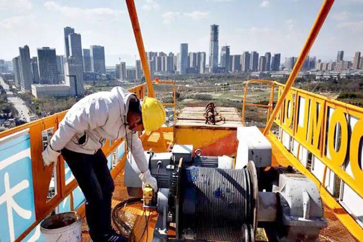 昆明龙四地块棚改项目施工人员在检查塔吊