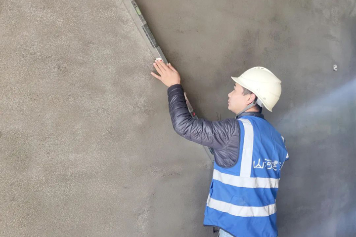 ▲遂川碧桂园项目抹灰班组工人进行石膏抹灰冲筋